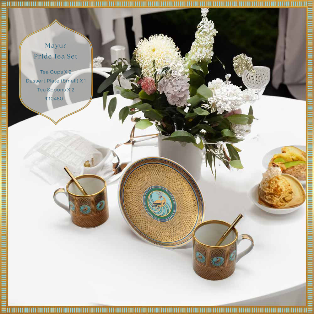 24 Carat Pure Gold ‘Mayur Dwar' Tea Set is exclusively curated, designed, with hand screen, transferred & fired at our studio. With colours and design inspiration from Rajasthan it could be a perfect souvenir for your loved ones in far-land.