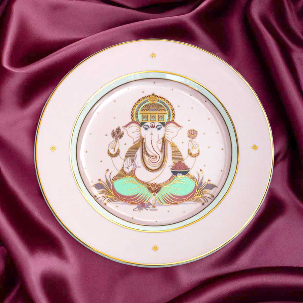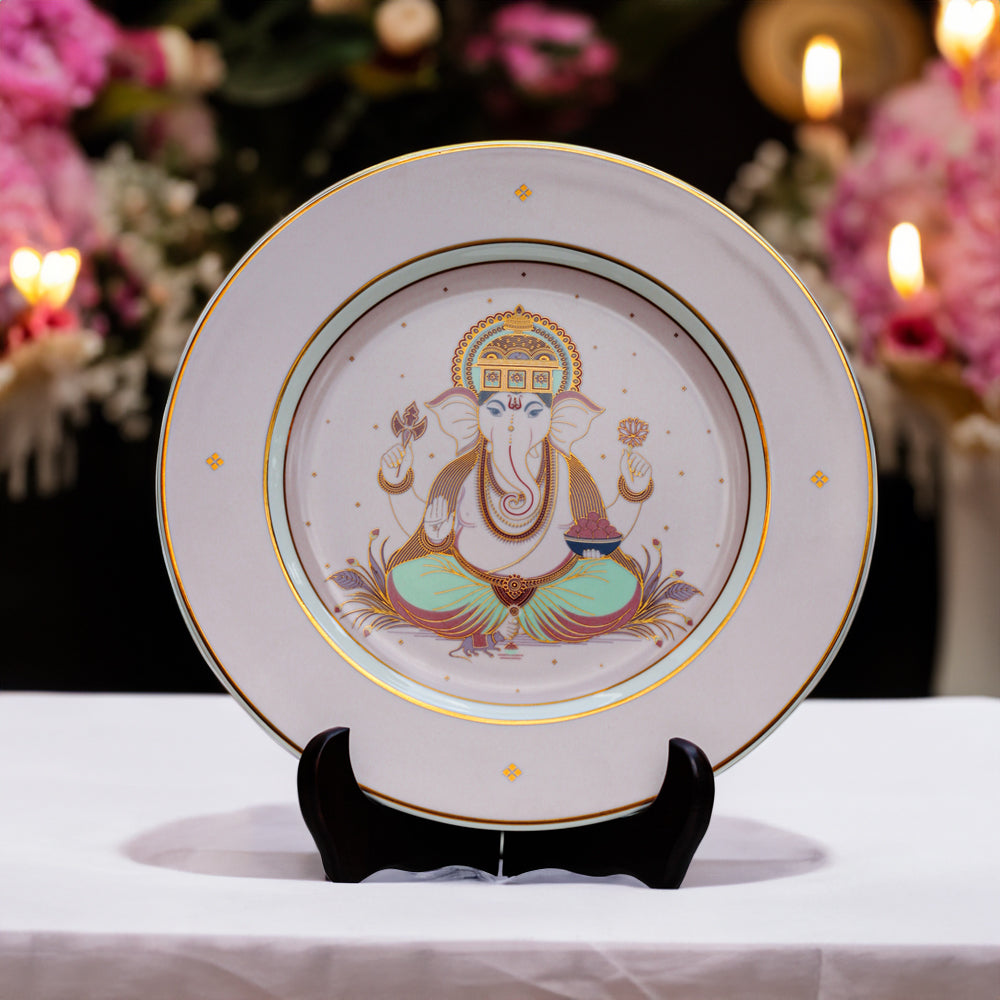 Lord Ganesha, revered as the remover of obstacles and the harbinger of auspicious beginnings, is worshipped before every new venture. The word Swayambhu means “self-originated,” signifying the divine presence that exists naturally and eternally. This plate, adorned with 24-carat gold detailing and crafted in soft pastel hues, embodies that serene grace. Placed on its elegant stand, — it is a symbol of peace, prosperity, and new beginnings, today and forever.