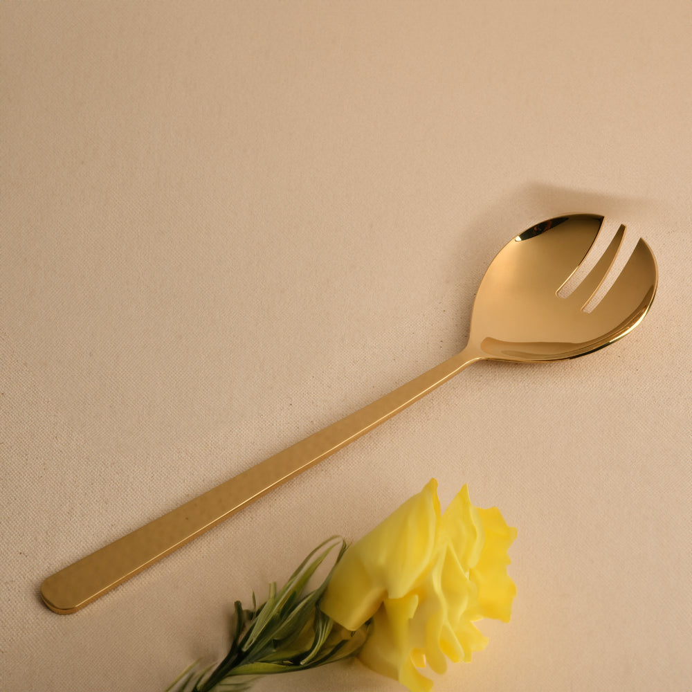 Crafted in stainless steel with delicate hammered detailing and a rich golden finish, it brings timeless elegance to everyday moments and special gatherings alike. Elevate your dining with our exquisite Hammered Salad Serving Spoon. Perfect for both everyday dining and special occasions.